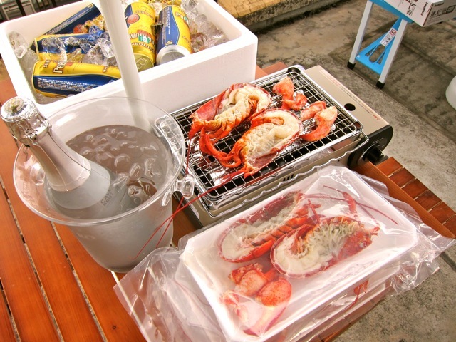 活ロブスターホタテ貝でバーベキューは大盛り上がり